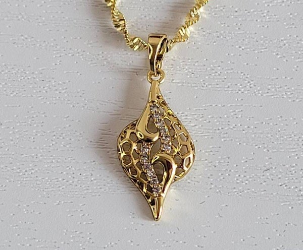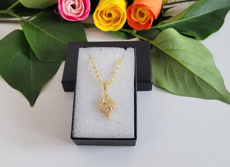 Die vergoldete Kette ist 45 cm lang, 0,03 mm fein und besitzt eine verdrehte (gedrehte) Struktur, die sie besonders elegant und filigran wirken lässt. Gefertigt aus 14 Karat vergoldetem, nickelfreiem Material, ist sie zudem antiallergisch – ideal für empfindliche Hauttypen.
