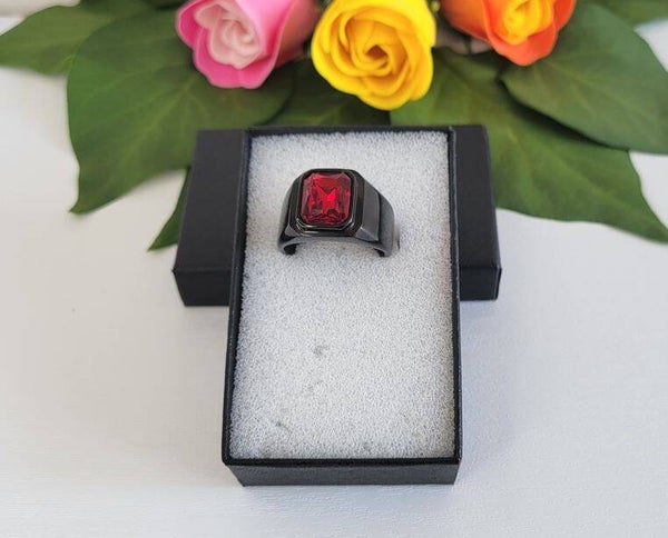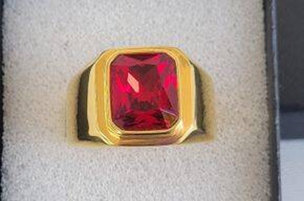 Dieser massive Herrenring aus hochwertigem Edelstahl in edler Gold- und Schwarzoptik ist ein Statement für Stilbewusstsein und Selbstbewusstsein. In der Mitte thront ein roter Zirkonia-Stein (12,5 mm hoch, 10 mm breit), der dem Ring eine kraftvolle Ausstrahlung verleiht.